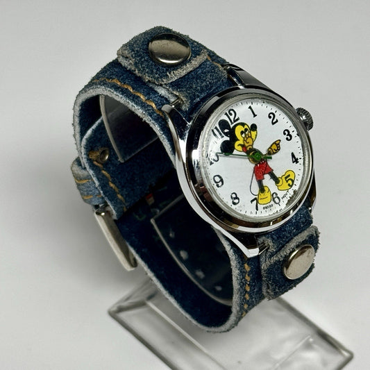 Vintage Swiss Made Mouse Watch Womens Denim Cuff Bracelet Mechanical Movement