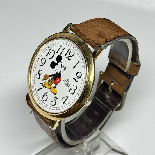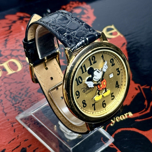 Vintage Disney Mickey Mouse Watch Mens Large Golden Case Leather Straps New Batt